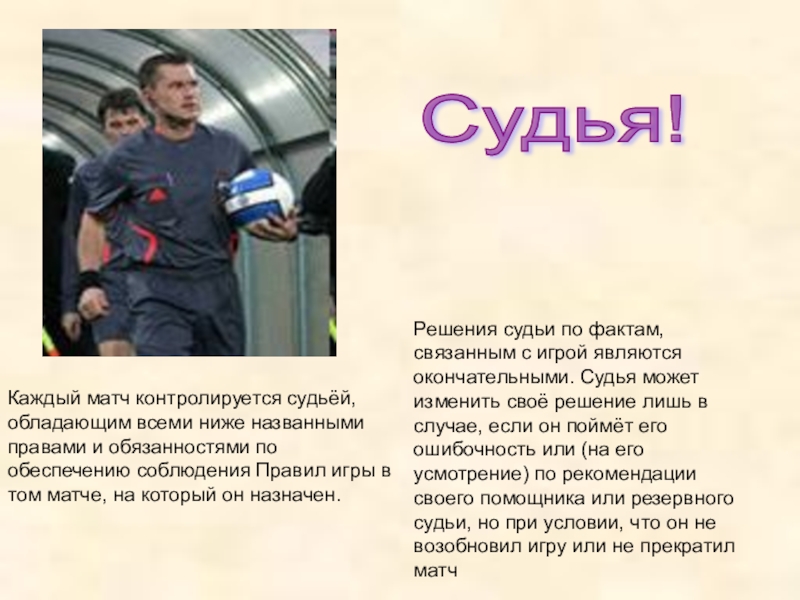 Решения судьи по фактам, связанным с игрой являются окончательными. Судья может изменить своё решение лишь в случае, если он поймёт его ошибочность или (на его усмотрение) по рекомендации своего помощника или резервного судьи, но при условии, что он не возобновил игру или не прекратил матч