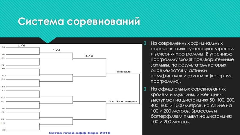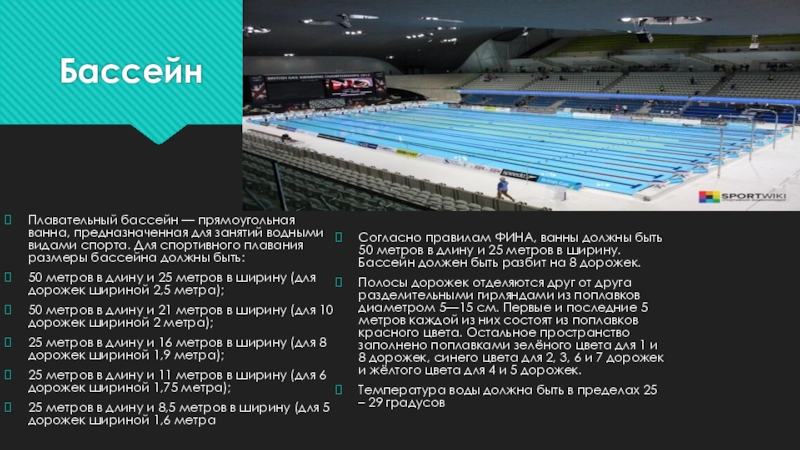 Согласно правилам ФИНА, ванны должны быть 50 метров в длину и 25 метров в ширину. Бассейн должен быть разбит на 8 дорожек.