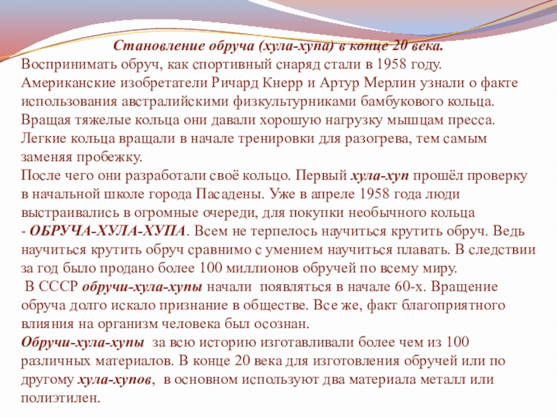 Слайд 5Становление обруча (хула-хупа) в конце 20 века.
