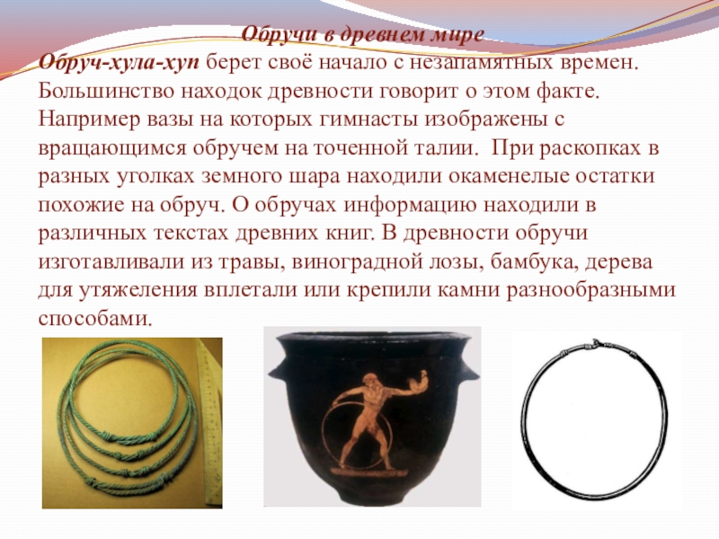 древности говорит о этом факте. Например вазы на которых гимнасты изображены с вращающимся обручем на точенной талии. При раскопках в разных уголках земного шара находили окаменелые остатки похожие на обруч. О обручах информацию находили в различных текстах древних книг. В древности обручи изготавливали из травы, виноградной лозы, бамбука, дерева для утяжеления вплетали или крепили камни разнообразными способами.