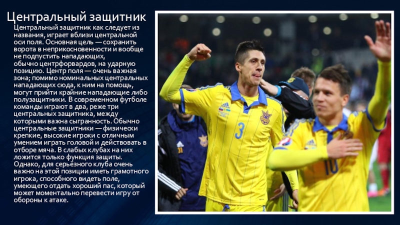поля. Основная цель — сохранить ворота в неприкосновенности и вообще не подпустить нападающих, обычно центрфорвардов, на ударную позицию. Центр поля — очень важная зона; помимо номинальных центральных нападающих сюда, к ним на помощь, могут прийти крайние нападающие либо полузащитники. В современном футболе команды играют в два, реже три центральных защитника, между которыми важна сыгранность. Обычно центральные защитники — физически крепкие, высокие игроки с отличным умением играть головой и действовать в отборе мяча. В слабых клубах на них ложится только функция защиты. Однако, для серьёзного клуба очень важно на этой позиции иметь грамотного игрока, способного видеть поле, умеющего отдать хороший пас, который может моментально перевести игру от обороны к атаке.