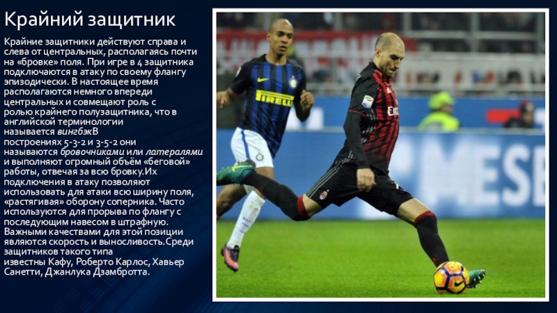 Крайний защитник Крайние защитники действуют справа и слева от центральных, располагаясь почти на «бровке» поля. При игре