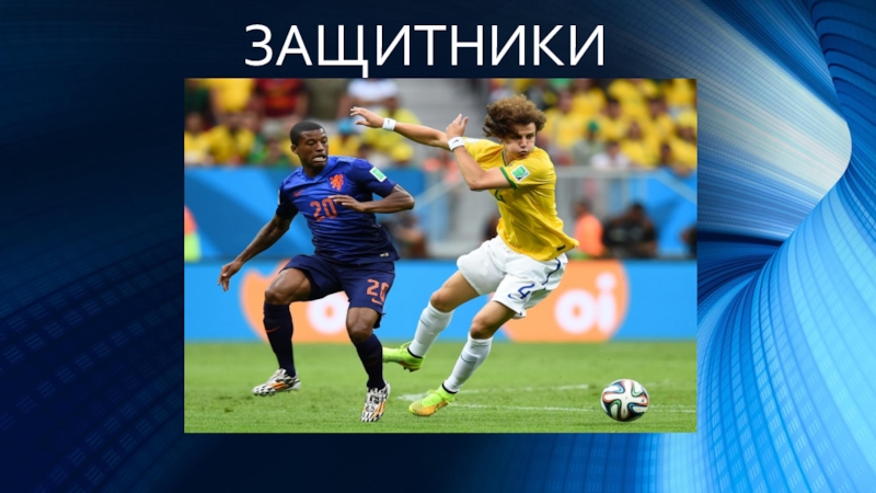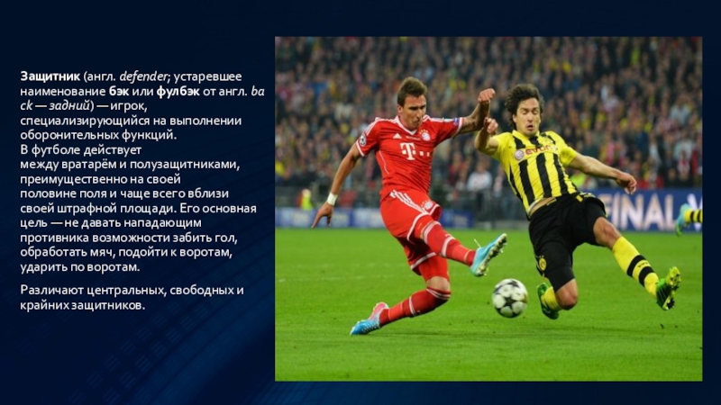 Слайд 2Защитник (англ. defender; устаревшее наименование бэк или фулбэк от англ. back — задний) — игрок, специализирующийся на выполнении оборонительных функций. В футболе действует между вратарём и полузащитниками,