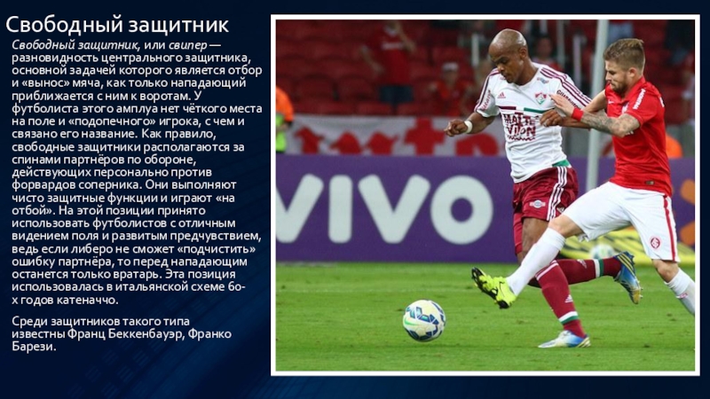 Свободный защитник Свободный защитник, или свипер — разновидность центрального защитника, основной задачей которого является отбор и «вынос» мяча, как только