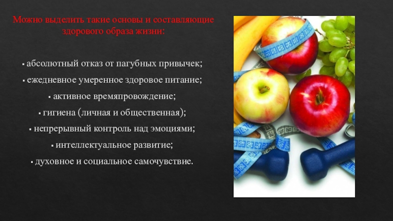 Слайд 8Можно выделить такие основы и составляющие здорового образа жизни: