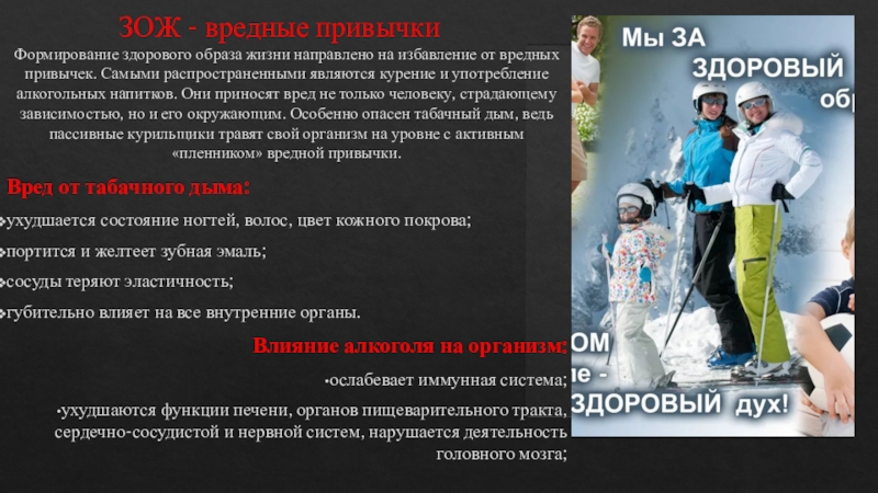 вредных привычек. Самыми распространенными являются курение и употребление алкогольных напитков. Они приносят вред не только человеку, страдающему зависимостью, но и его окружающим. Особенно опасен табачный дым, ведь пассивные курильщики травят свой организм на уровне с активным «пленником» вредной привычки.