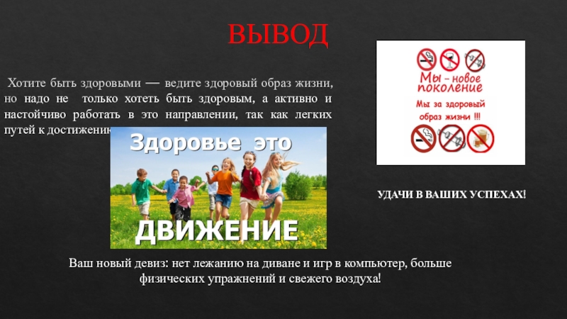 В своей работе мы постарались раскрыть понятие здоровья и значения здорового образа жизни для человека. В ходе работы над проектом, изучая дополнительную литературу и Internet – ресурсы выявили, что здоровый образ жизни помогает нам выполнять наши цели и задачи, успешно реализовывать свои планы, справляться с трудностями, а если придется, то и с колоссальными перегрузками. Крепкое здоровье, поддерживаемое и укрепляемое самим человеком, позволит ему прожить долгую и полную радостей жизнь.