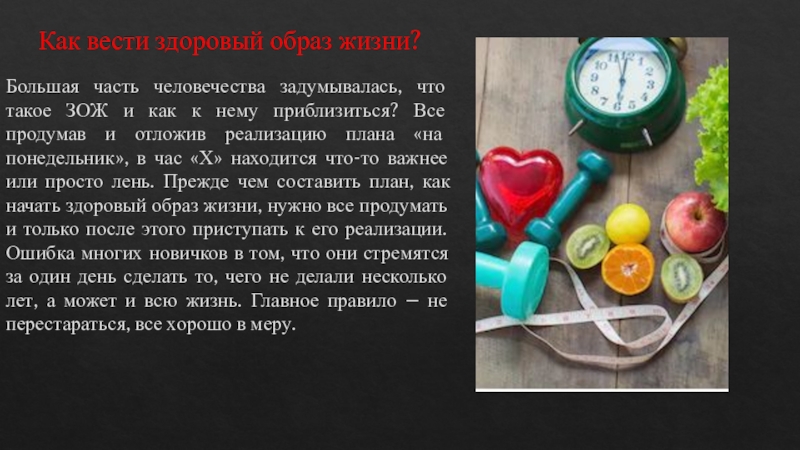 и как к нему приблизиться? Все продумав и отложив реализацию плана «на понедельник», в час «Х» находится что-то важнее или просто лень. Прежде чем составить план, как начать здоровый образ жизни, нужно все продумать и только после этого приступать к его реализации. Ошибка многих новичков в том, что они стремятся за один день сделать то, чего не делали несколько лет, а может и всю жизнь. Главное правило – не перестараться, все хорошо в меру.