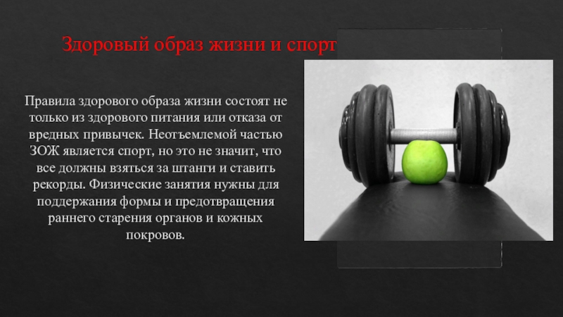 из здорового питания или отказа от вредных привычек. Неотъемлемой частью ЗОЖ является спорт, но это не значит, что все должны взяться за штанги и ставить рекорды. Физические занятия нужны для поддержания формы и предотвращения раннего старения органов и кожных покровов.