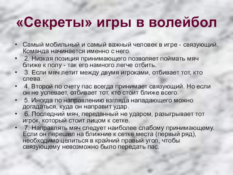 Слайд 8«Секреты» игры в волейбол