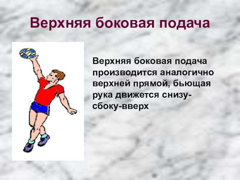 Верхняя боковая подача производится аналогично верхней прямой, бьющая рука