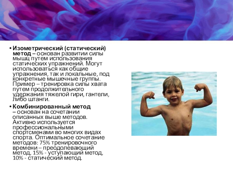 Слайд 4Изометрический (статический) метод – основан развитии силы мышц путем использования статических упражнений.