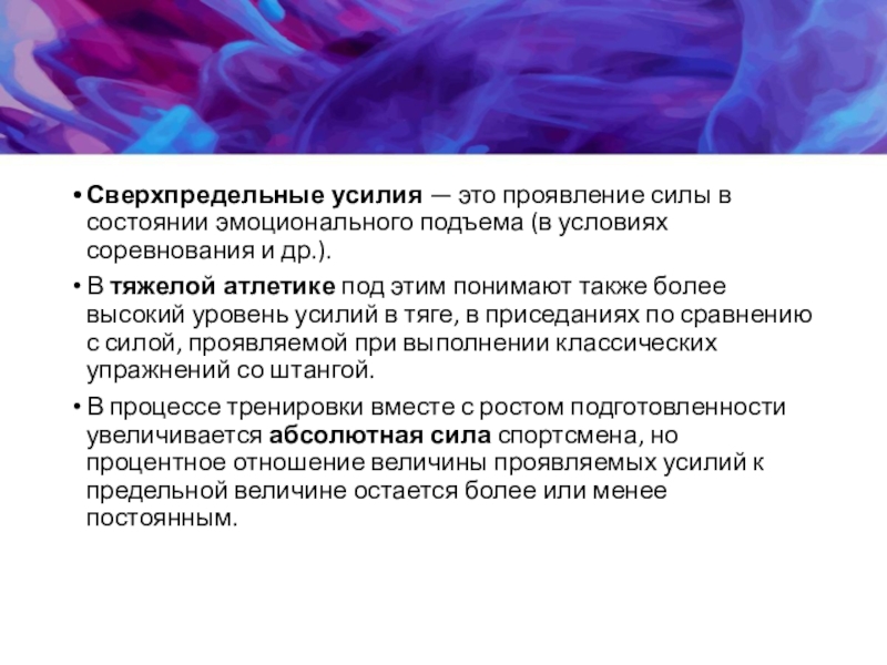 Слайд 5Сверхпредельные усилия — это проявление силы в состоянии эмоционального подъема (в условиях