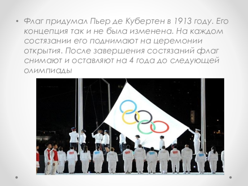Слайд 21Флаг придумал Пьер де Кубертен в 1913 году. Его концепция так