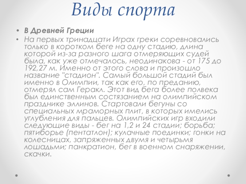 в коротком беге на одну стадию, длина которой из-за разного шага отмеряющих судей была, как уже отмечалось, неодинакова - от 175 до 192,27 м. Именно от этого слова и произошло название "стадион". Самый большой стадий был именно в Олимпии, так как его, по преданию, отмерял сам Геракл. Этот вид бега более полвека был единственным состязанием на олимпийском празднике эллинов. Стартовали бегуны со специальных мраморных плит, в которых имелись углубления для пальцев. Олимпийских игр входили следующие виды - бег на 1,2 и 24 стадии; борьба; пятиборье (пентатлон); кулачные поединки; гонки на колесницах, запряженных двумя и четырьмя лошадьми; панкратион, бег в военном снаряжении, скачки.