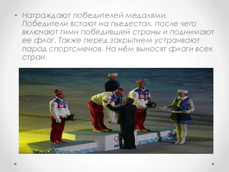 Слайд 23Награждают победителей медалями. Победители встают на пьедестал, после чего включают гимн