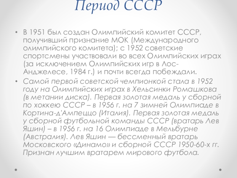 (Международного олимпийского комитета); с 1952 советские спортсмены участвовали во всех Олимпийских играх (за исключением Олимпийских игр в Лос-Анджелесе, 1984 г.) и почти всегда побеждали.