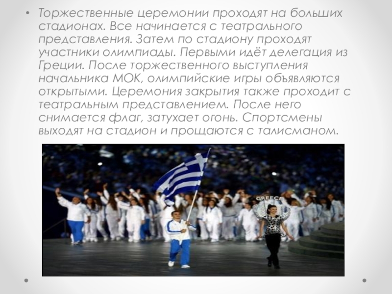 Слайд 22Торжественные церемонии проходят на больших стадионах. Все начинается с театрального представления.
