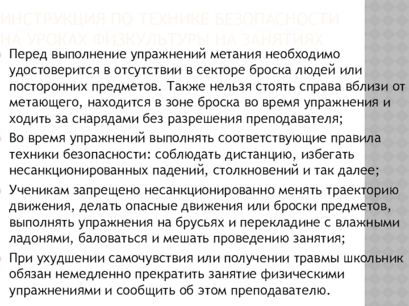 метания необходимо удостоверится в отсутствии в секторе броска людей или посторонних предметов. Также нельзя стоять справа вблизи от метающего, находится в зоне броска во время упражнения и ходить за снарядами без разрешения преподавателя;