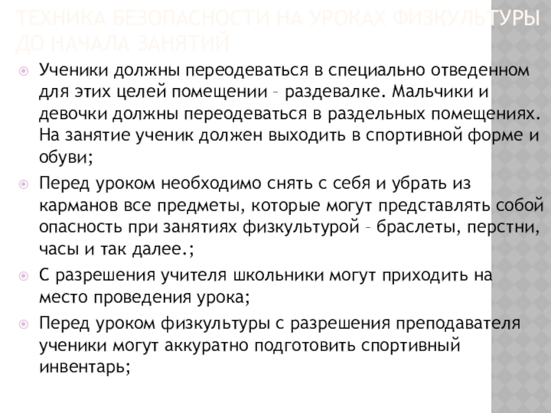 Слайд 5Техника безопасности на уроках физкультуры до начала занятий