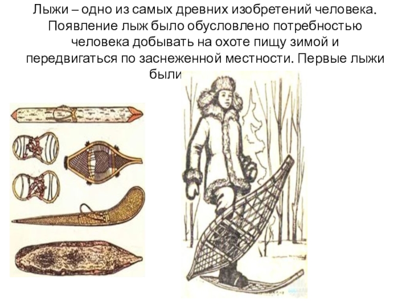обусловлено потребностью человека добывать на охоте пищу зимой и передвигаться по заснеженной местности. Первые лыжи были ступающие.