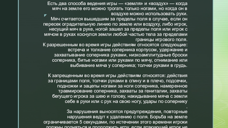 Слайд 5Есть два способа ведения игры — «земля» и «воздух» — когда мяч на