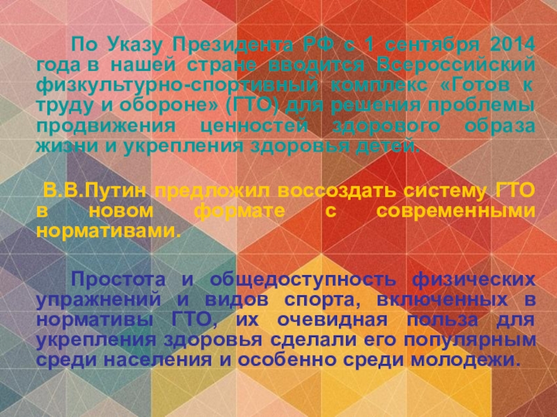 В.В.Путин предложил воссоздать систему ГТО в новом формате с современными нормативами.