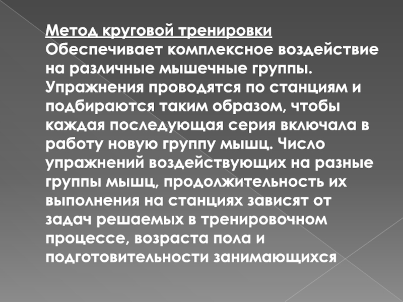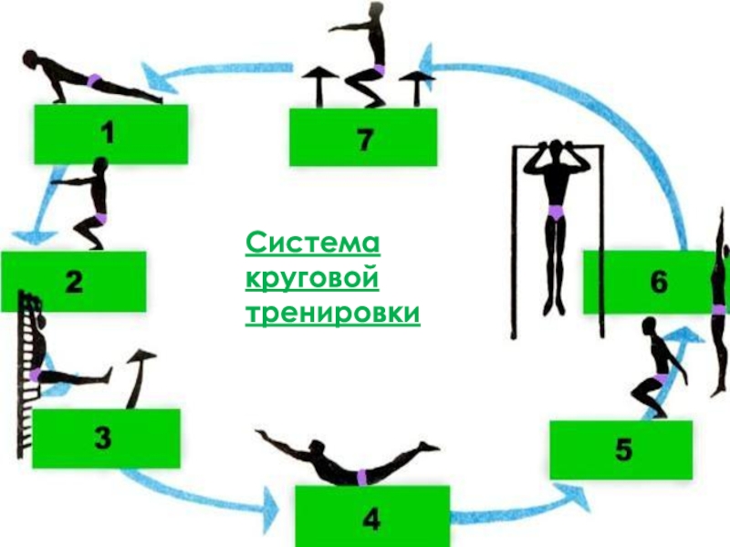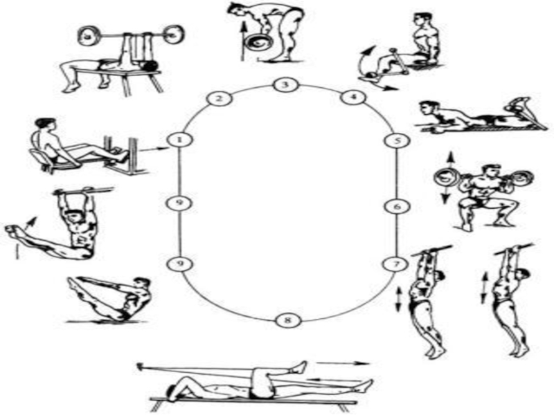 по станциям и подбираются таким образом, чтобы каждая последующая серия включала в работу новую группу мышц. Число упражнений воздействующих на разные группы мышц, продолжительность их выполнения на станциях зависят от задач решаемых в тренировочном процессе, возраста пола и подготовительности занимающихся