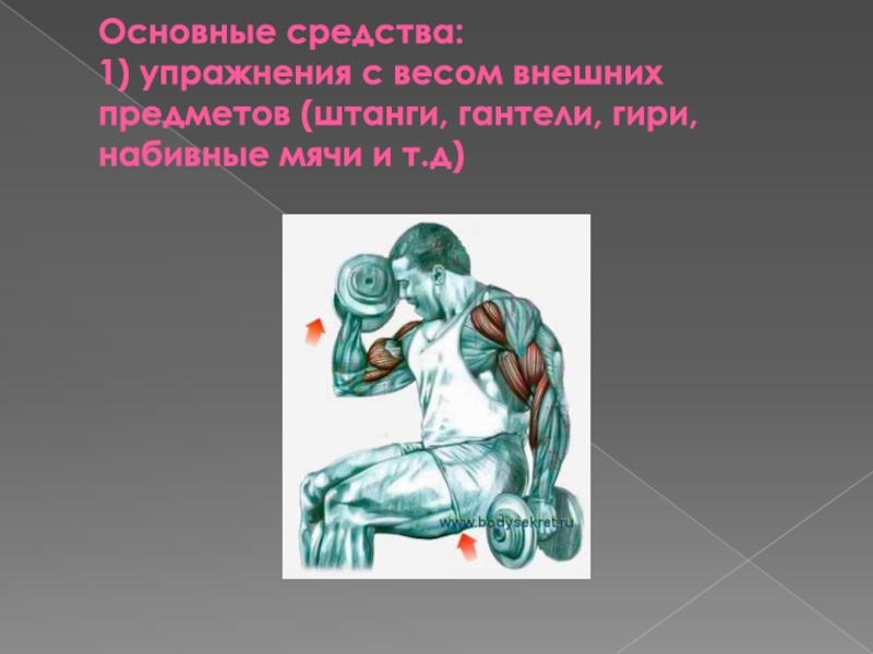 1) упражнения с весом внешних предметов (штанги, гантели, гири, набивные