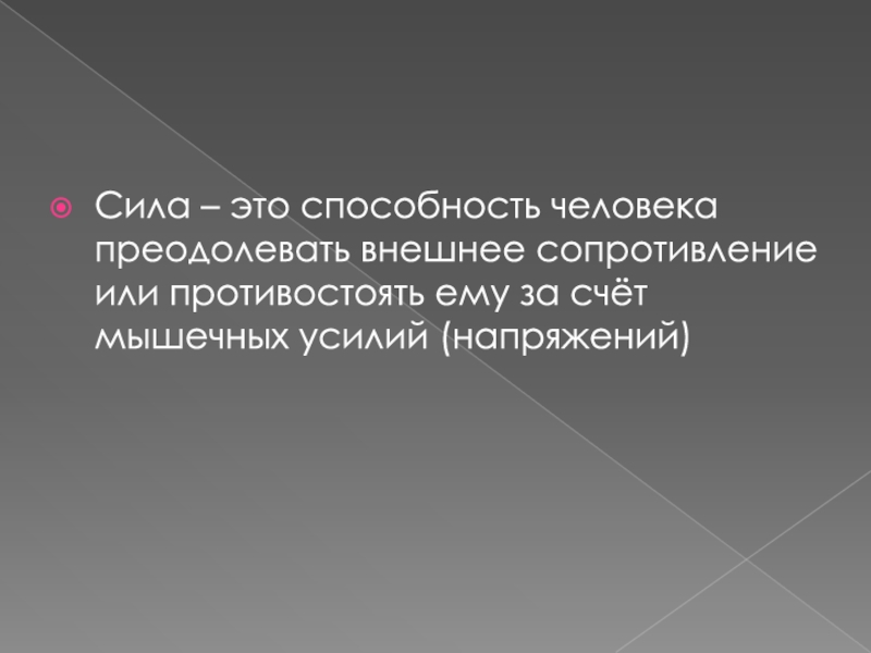 Слайд 2Сила – это способность человека преодолевать внешнее сопротивление или противостоять ему