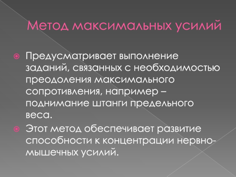 Предусматривает выполнение заданий, связанных с необходимостью преодоления максимального сопротивления,