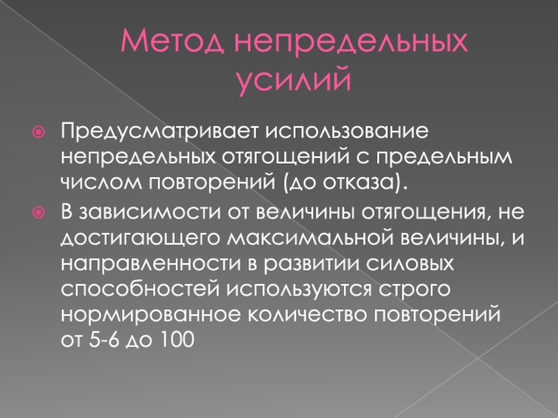 Предусматривает использование непредельных отягощений с предельным числом повторений (до