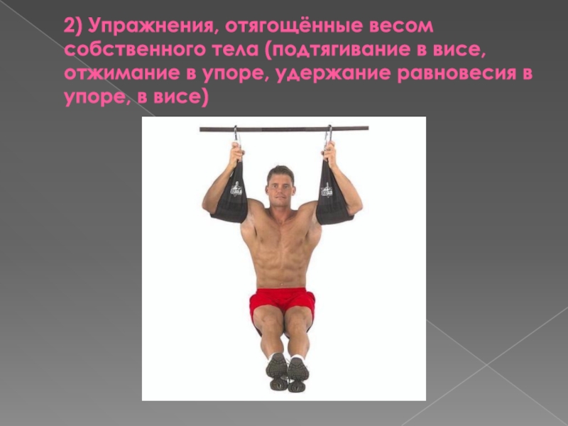 Слайд 92) Упражнения, отягощённые весом собственного тела (подтягивание в висе, отжимание в