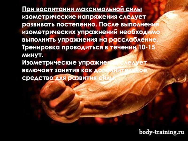 При воспитании максимальной силы изометрические напряжения следует развивать постепенно. После выполнения