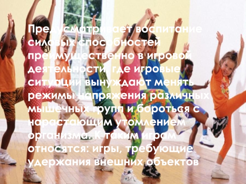 Предусматривает воспитание силовых способностей преимущественно в игровой деятельности, где игровые