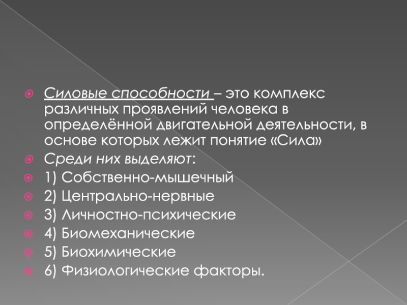 Слайд 4Силовые способности – это комплекс различных проявлений человека в определённой двигательной