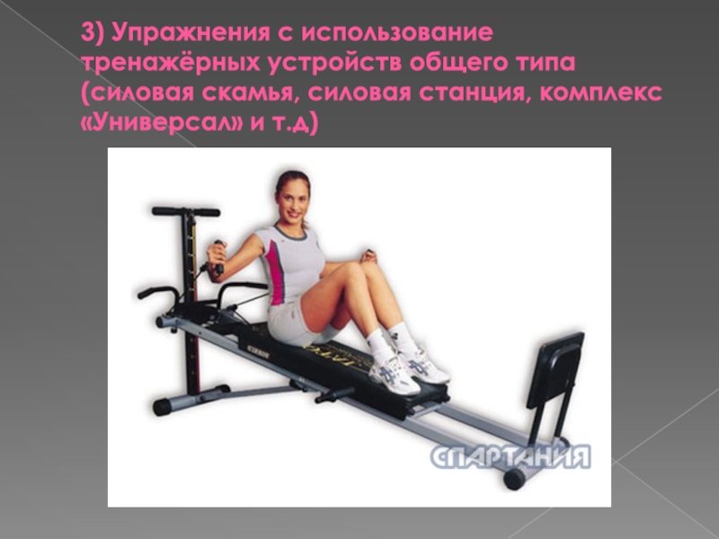 Слайд 103) Упражнения с использование тренажёрных устройств общего типа (силовая скамья, силовая