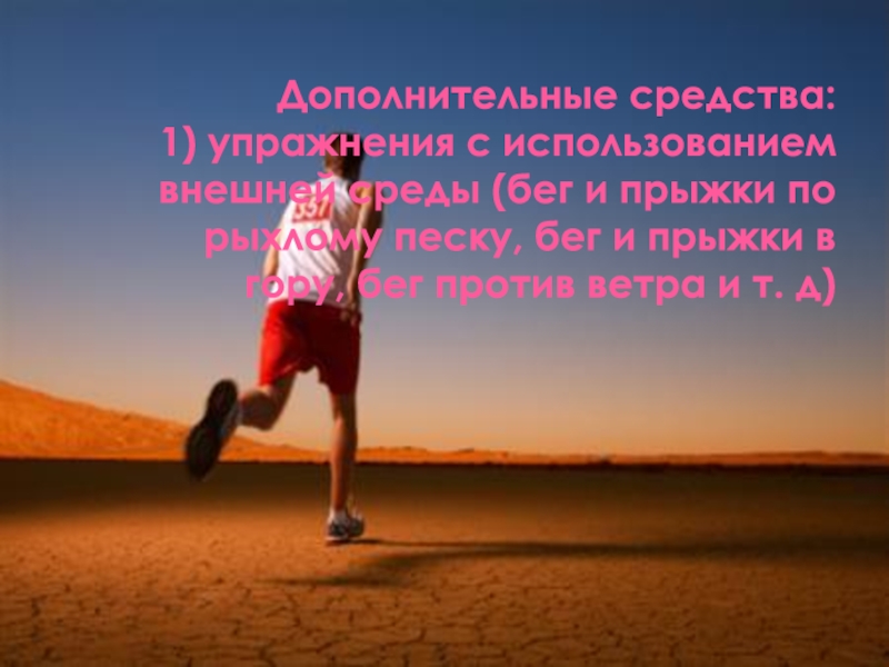 по рыхлому песку, бег и прыжки в гору, бег против ветра и т. д)