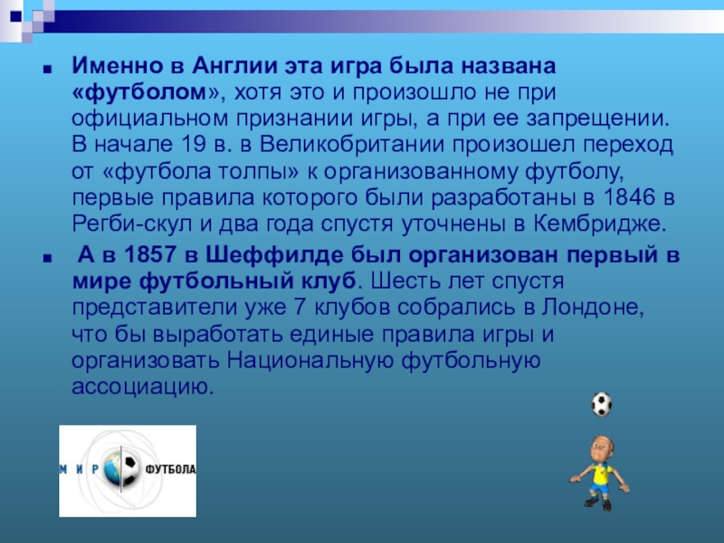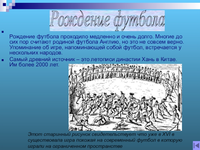 Рождение футбола проходило медленно и очень долго. Многие до сих пор считают родиной футбола Англию, но это не совсем верно. Упоминание об игре, напоминающей собой футбол, встречается у нескольких народов.