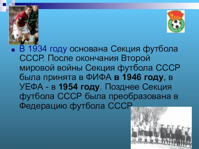 В 1934 году основана Секция футбола СССР. После окончания Второй мировой войны Секция футбола СССР была принята в ФИФА в 1946 году, в УЕФА - в 1954 году. Позднее Секция футбола СССР была преобразована в Федерацию футбола СССР.