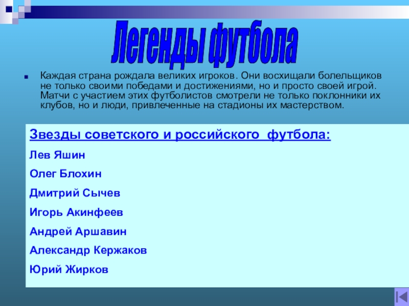 Каждая страна рождала великих игроков. Они восхищали болельщиков не только своими победами и достижениями, но и просто своей игрой. Матчи с участием этих футболистов смотрели не только поклонники иx клубов, но и люди, привлеченные на стадионы их мастерством.