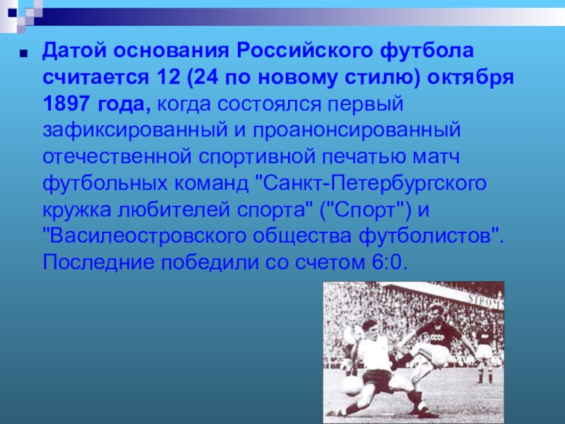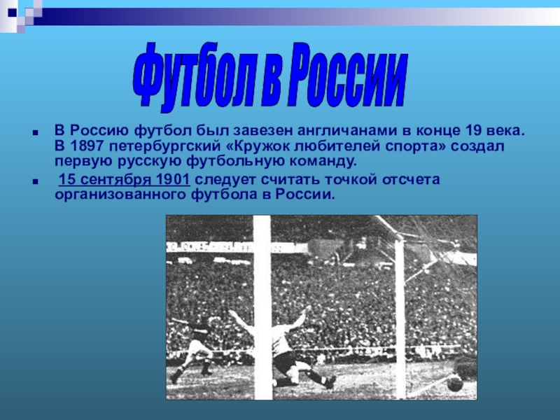 В Россию футбол был завезен англичанами в конце 19 века. В 1897 петербургский «Кружок любителей спорта» создал первую русскую футбольную команду.