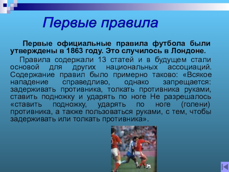 Первые официальные правила футбола были утверждены в 1863 году. Это случилось в Лондоне.