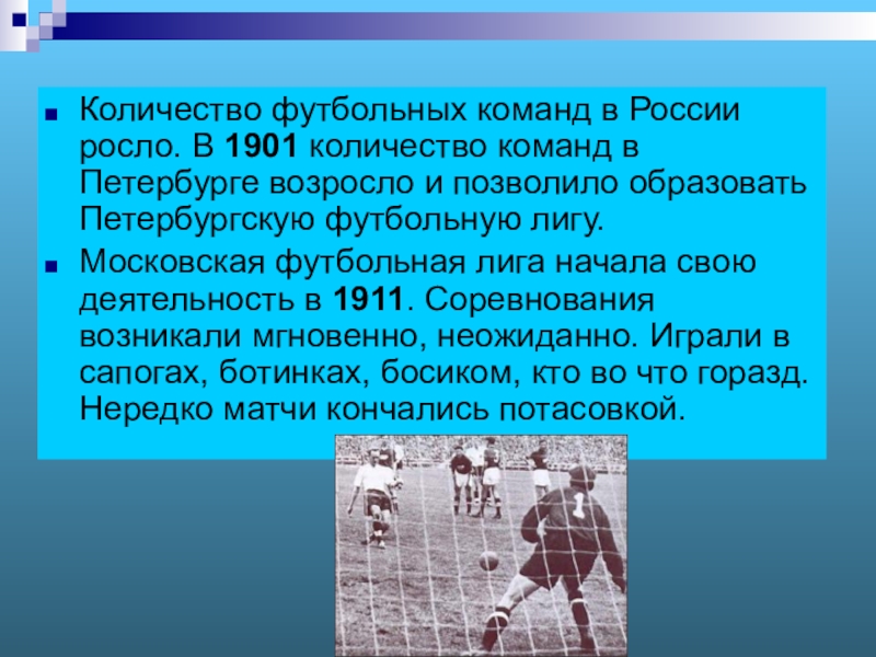 Количество футбольных команд в России росло. В 1901 количество команд в Петербурге возросло и позволило образовать Петербургскую футбольную лигу.
