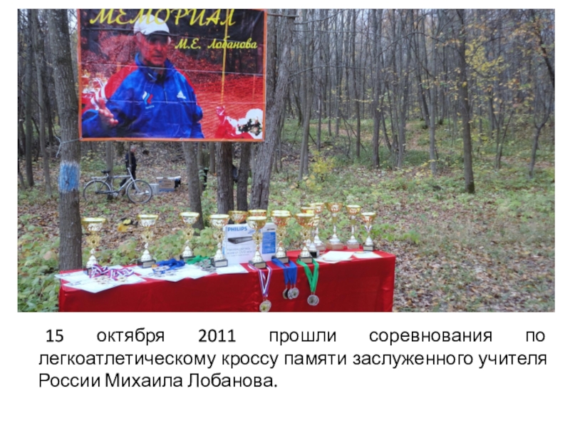 Слайд 9 15 октября 2011 прошли соревнования по легкоатлетическому кроссу памяти заслуженного учителя