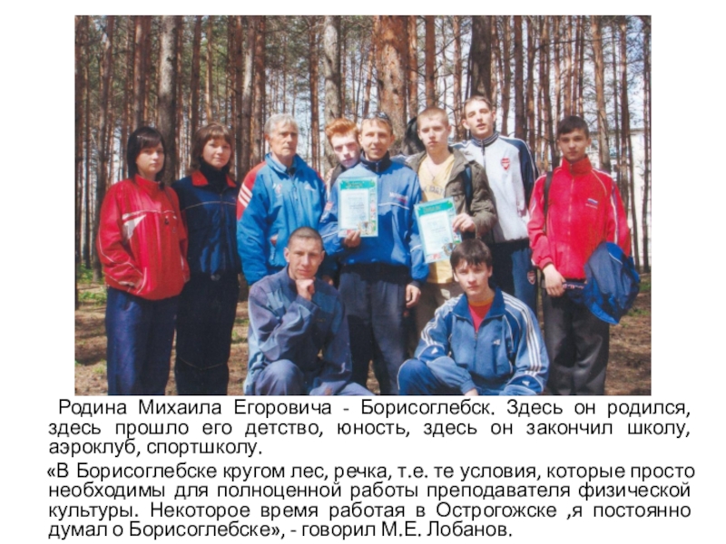 «В Борисоглебске кругом лес, речка, т.е. те условия, которые просто необходимы для полноценной работы преподавателя физической культуры. Некоторое время работая в Острогожске ,я постоянно думал о Борисоглебске», - говорил М.Е. Лобанов.