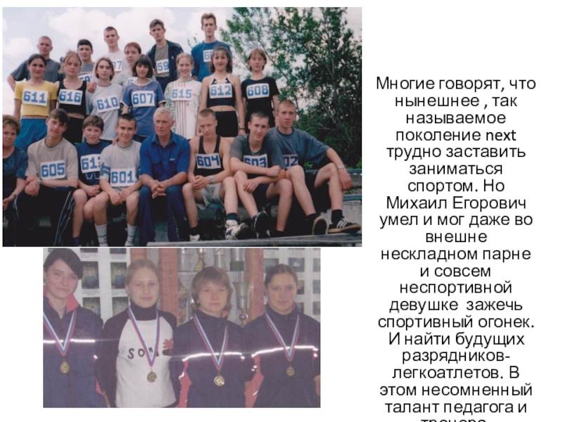 next трудно заставить заниматься спортом. Но Михаил Егорович умел и мог даже во внешне нескладном парне и совсем неспортивной девушке зажечь спортивный огонек. И найти будущих разрядников-легкоатлетов. В этом несомненный талант педагога и тренера.