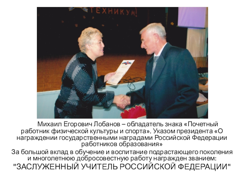 Слайд 8 Михаил Егорович Лобанов – обладатель знака «Почетный работник физической культуры и