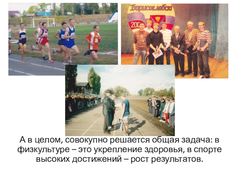 А в целом, совокупно решается общая задача: в физкультуре – это укрепление здоровья, в спорте высоких достижений