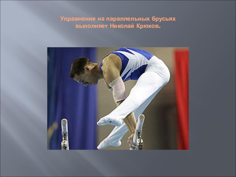 Слайд 5Упражнение на параллельных брусьях выполняет Николай Крюков.